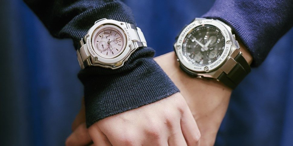 ケースやベゼルにソリッドなメタル素材を、バンドには樹脂素材を採用したペアモデル。