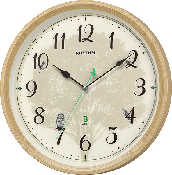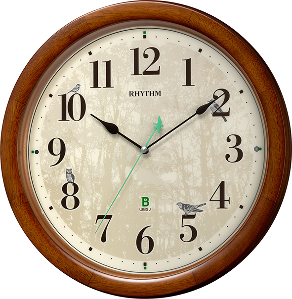 ▼ 特 徴 ウォールナット無垢材の枠と深い森の中をイメージした文字板が特徴。文字板には、2時にヒヨドリ、5時にカッコウ、8時にコノハズク、10時にシジュウカラがとまっています。